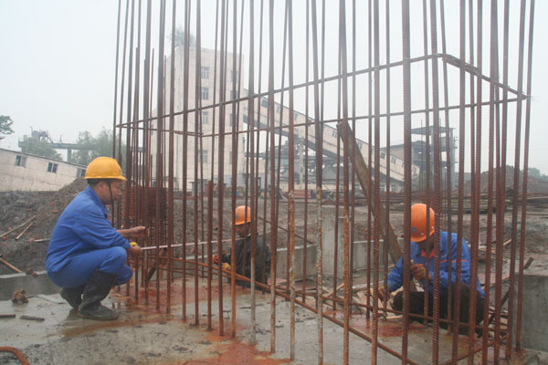 圖一:7月9日上午,天空下著淅瀝小雨。施工人員在5#碼頭細碎廠房設備基礎施工現場綁扎鋼筋。