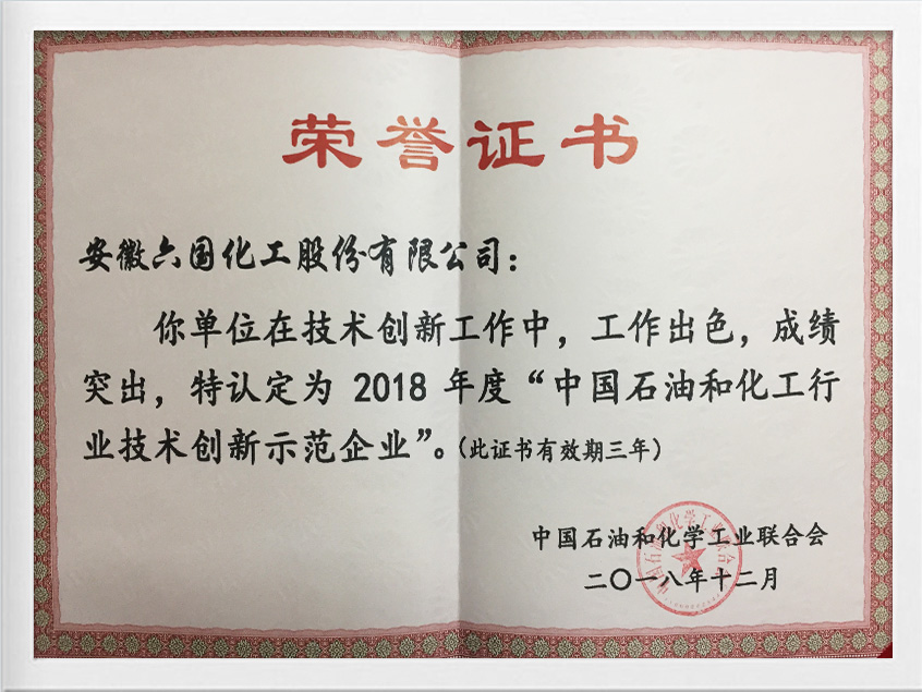 中國石化行業技術創新示范企業證書2018年